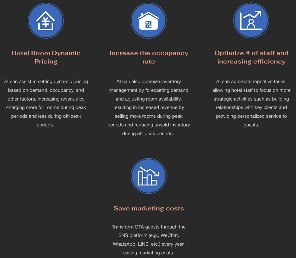 Smart room technology integrated with AI can provide guests with a more comfortable and convenient stay. AI can also be used to monitor and predict maintenance needs in hotel rooms, optimize pricing and inventory decisions, forecast demand and adjust room availability accordingly, optimize energy efficiency, and reduce the costs associated with managing and operating the hotel.