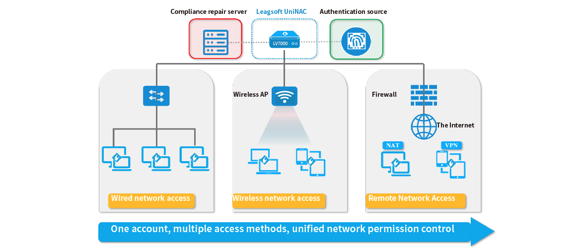UniNAC prefer direct collaborating with network devices to achieving excellent network security, reliability and networking flexibility, and currently has adapted to hundreds of models of network devices natively. With Leagsoft NACC access controller, UniNAC can adapt to all kinds of complex networks including LAN (Switch/HUB), WLAN, WAN, VPN, and even NAT environments.